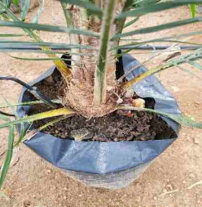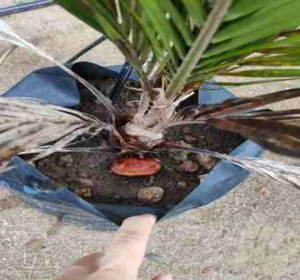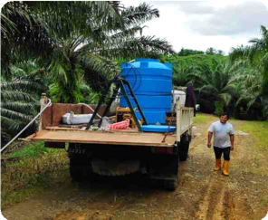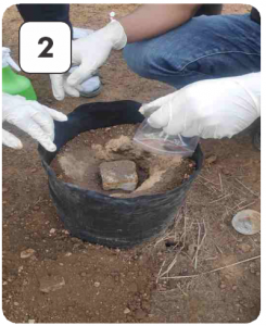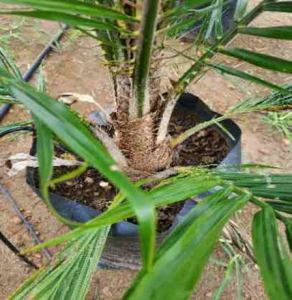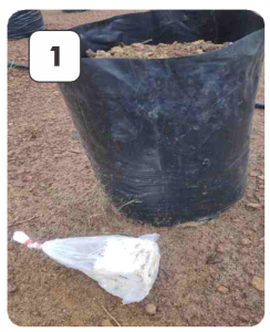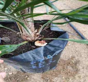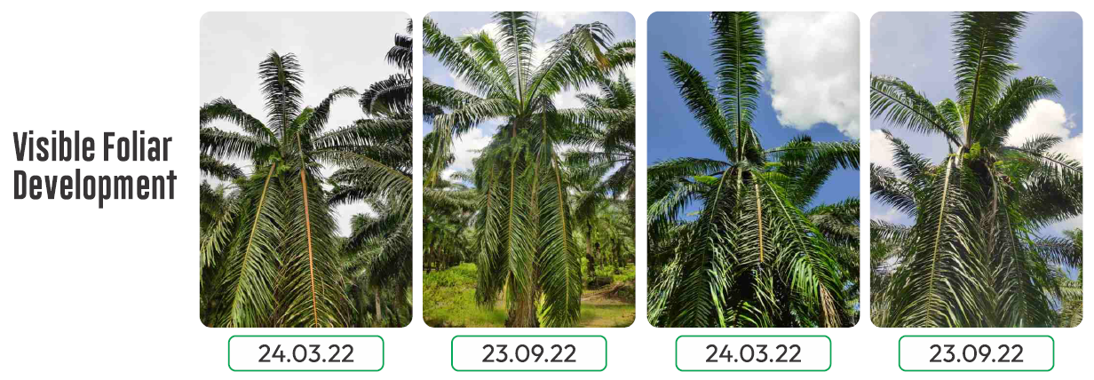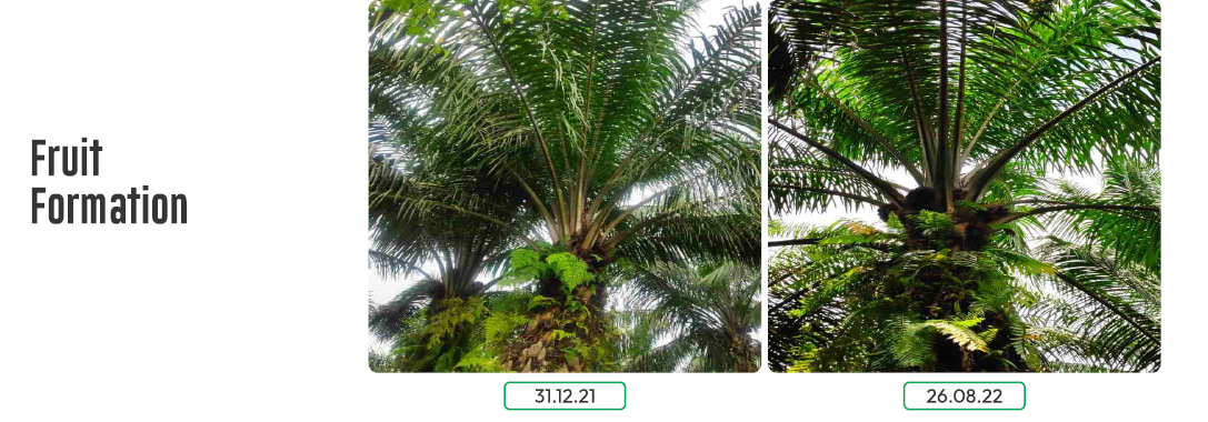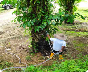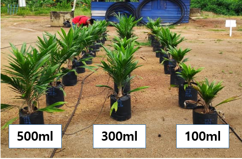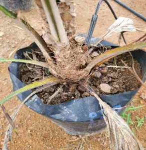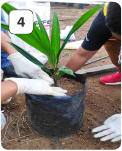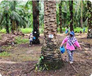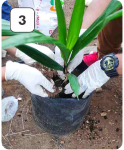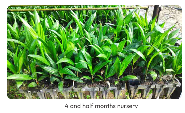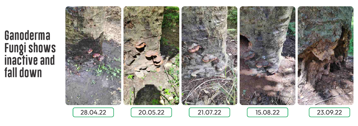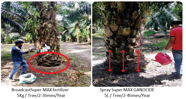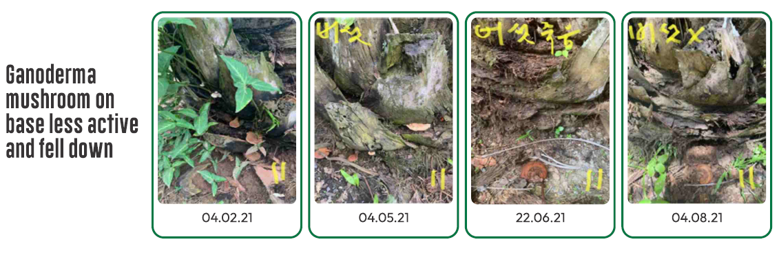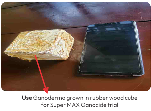During transplanting, rubber cube innoculated with Ganoderma is added (placed directly below the palm seedling roots)